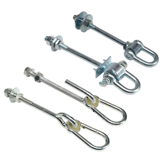 KBT Swinging “D” Shackle Swing Hanger with Spikes and Snap Hook Set provide secure and reliable connection points for swings and accessories on your play structure. Each component is crafted from strong, corrosion-resistant steel to ensure durability and long-term safety for outdoor use. These are ideal for DIY playground builders or those upgrading existing swing installations.